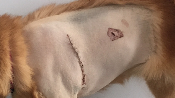 Depending on where the incision is, sometimes a pet can wear a t-shirt or onesie instead of an E-collar, but it’s essential that your pet is unable to lick or chew at the incision. There is bacteria in your dog’s mouth, and licking the incision can introduce an infection or cause the incision to open up. The E-collar needs to be worn until the incision is completely healed which usually takes 10-14 days.