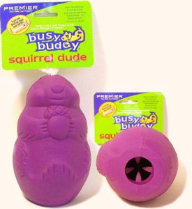 There are certainly other brands of toys that resemble Kongs available, but the Kong is the “original” toy and is the one that seems to work best for most dogs. There is one Kong knock-off on the market which may be of interest to some people though, and that is the “Squirrel Dude” toy manufactured by PetSafe. This tough purple toy (yes, it resembles a squirrel) improves on the Kong design by adding four small rubber prongs which line the inside of the toy’s hole. These prongs make it much harder to get food back out of a Squirrel Dude toy once you’ve stuffed it in. A Squirrel Dude toy is not for a beginner to puzzle stuffing, but can provide a nice challenge to dogs for whom a Kong toy no longer gives any challenge. The Squirrel Dude toys can be further customized by lopping off one or more of the rubber prongs with a sharp pair of scissors, so that you can adjust the toy’s level of difficulty.