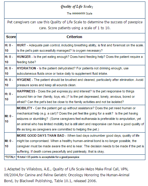 How do you know if it’s the right time to euthanize a pet? Well, there’s rarely a perfect time. In my role at AERC, I facilitate a Pet Loss Support Group, and it is unusual to find a pet owner who doesn’t question the timing of their pet’s death. “I euthanized him too soon,” or “I waited too long; he was suffering” are common refrains at our meetings. There is, however, a generally agreed upon quality-of-life scale that can aid a pet owner in making this difficult decision. Asking yourself such questions as, “Is my pet in pain?” “Is he eating enough?” “Is he able to keep himself clean?” and rating your responses on a scale of 1-10 can provide important insight and a more objective perspective than you may be able to provide at this time.
